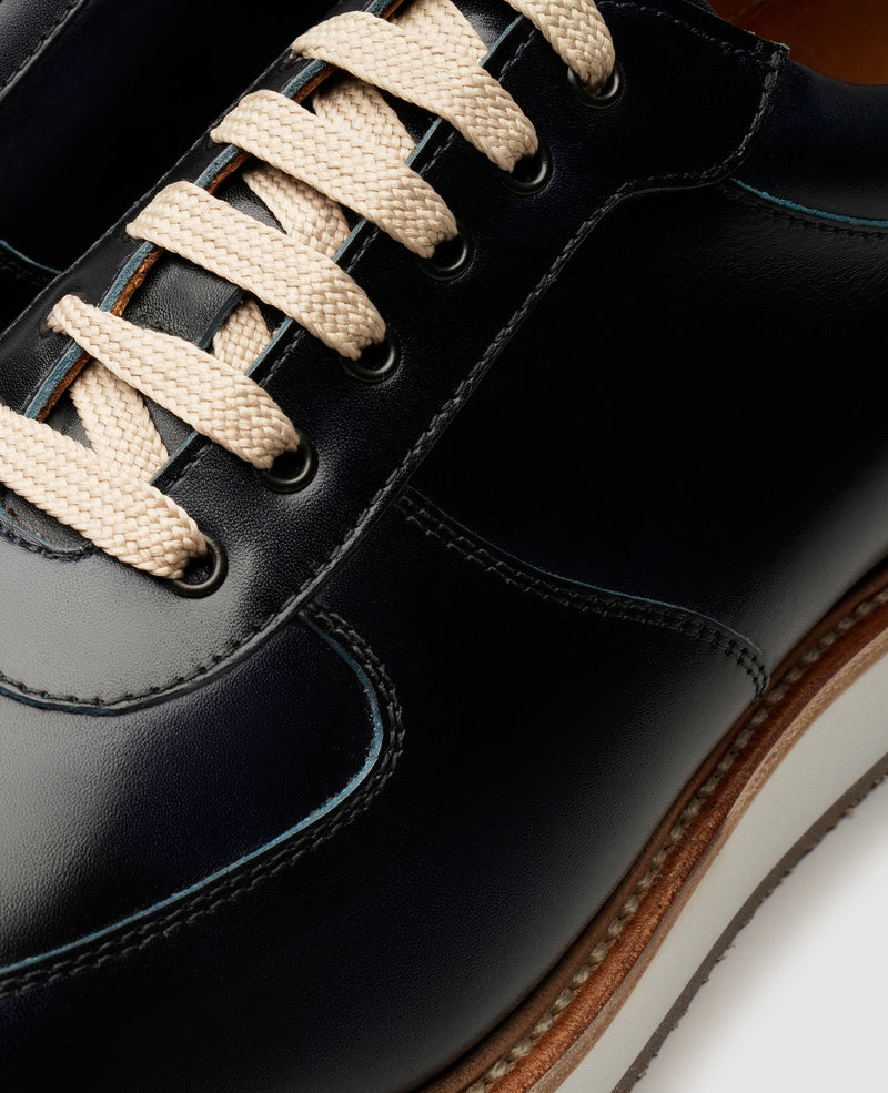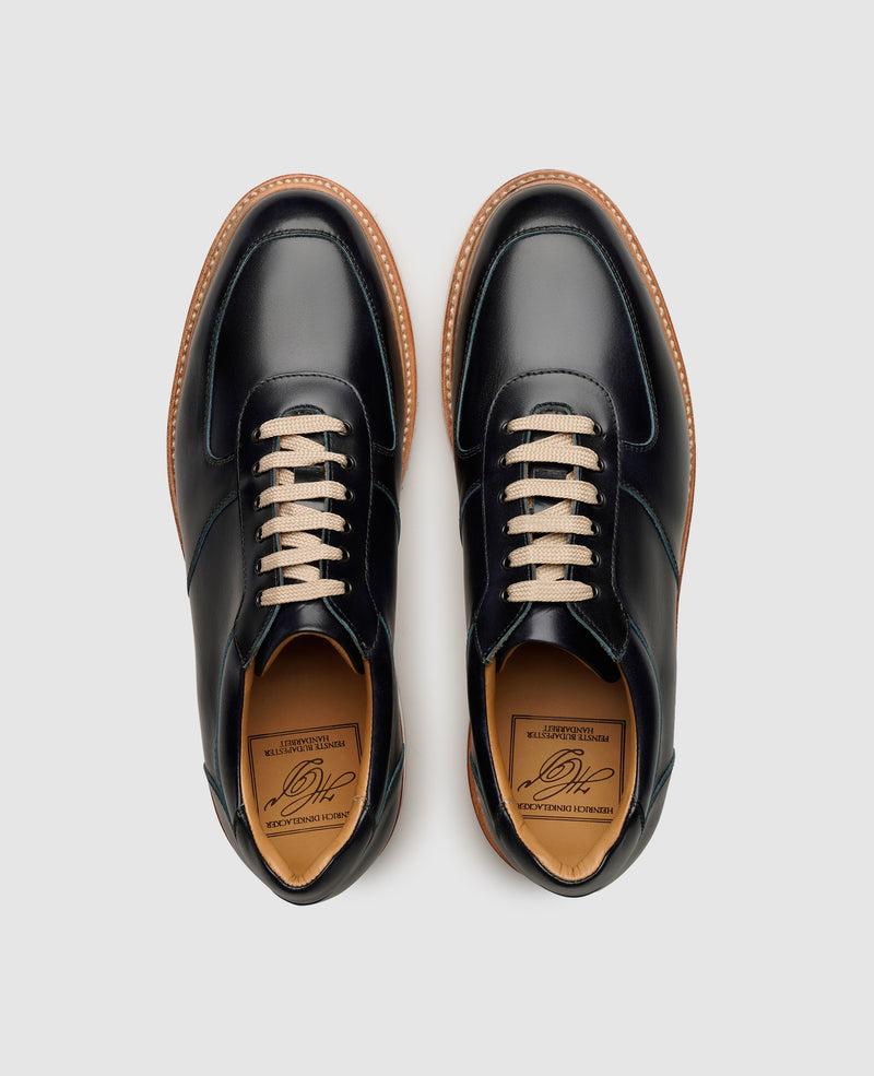 In der Kollektion von Heinrich Dinkelacker präsentiert sich der sportive Alltagsschuh in einer wahrlich anspruchsvollen Interpretation und richtet sich an alle Herren, die auch bei ihrem legeren Auftritt Wert auf Qualität, Komfort und Ästhetik legen. Das Schuhoberteil begeistert mit geschmeidigem Glattleder von intensivem Glanz. Dank einer aufwendigen Prozedur erhält das erlesene Kalbsleder von Hand ein atemberaubendes Finish und beeindruckt mit faszinierenden Farbschattierungen.Der mehrteilige Schaftgrundschnitt verleiht dem rahmengenähten Edel-Sneaker eine gewisse Dynamik, ohne dabei aufdringlich zu wirken. Zum absoluten Blickfang avanciert zweifellos die mehrfarbige Gummilaufsohle, welche gemeinsam mit der traditionellen Leistenform und der aufwendigen Machart ein überaus komfortables Geherlebnis garantiert.