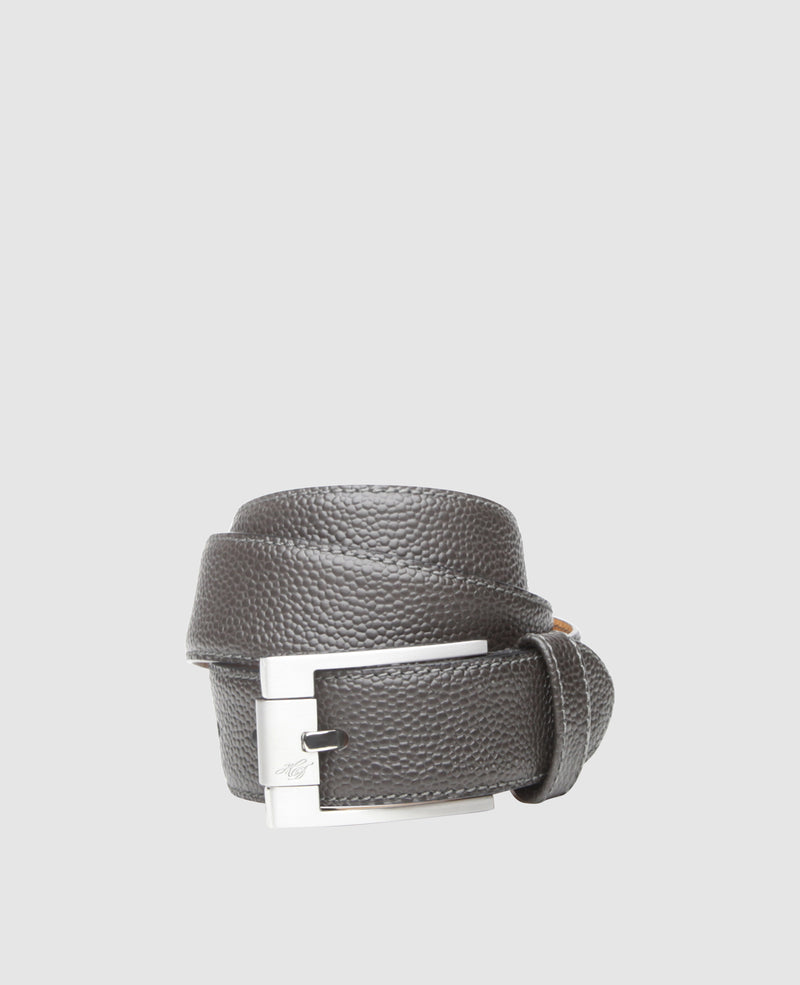 Das geprägte Kalbsleder des Artgrain Gürtels ist wohl das außergewöhnlichste Material im Hause Dinkelacker. Seine geschlossene Oberfläche besitzt eine angenehme Haptik und ist außerordentlich schmutzabweisend. Gleichzeitig ist das Leder widerstandsfähig und bedarf keiner speziellen Pflege. Wie alle unsere Gürtelmodelle, so besitzt auch Marian eine rückseitige Schicht aus Rindsleder, die dem robusten Obermaterial in nichts nachsteht.Abgeschlossen wird der 35mm breite Gürtel durch die klassische gebürstete Schließe mit einfachem Dorn und Heinrich Dinkelacker Gravur. Dieser Gürtel empfiehlt sich zu allen Schuhen mit der Bezeichnung AG.